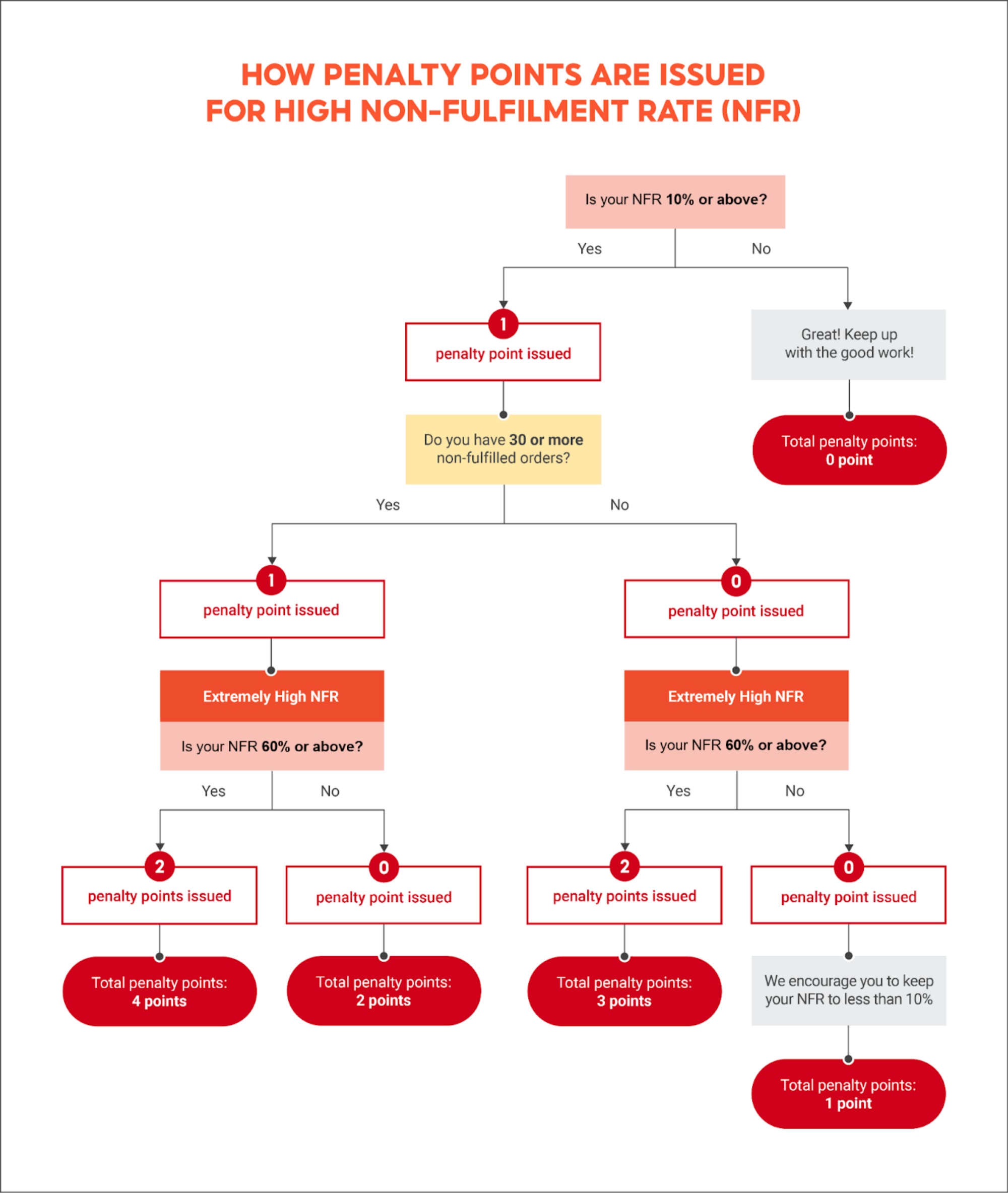 According to Shopee’s seller guidelines, the platform tracks seller performance using a penalty points system. Sellers can receive penalty points for issues such as a high non-fulfilment rate (NFR), which includes orders that are cancelled or refunded due to the seller’s fault.