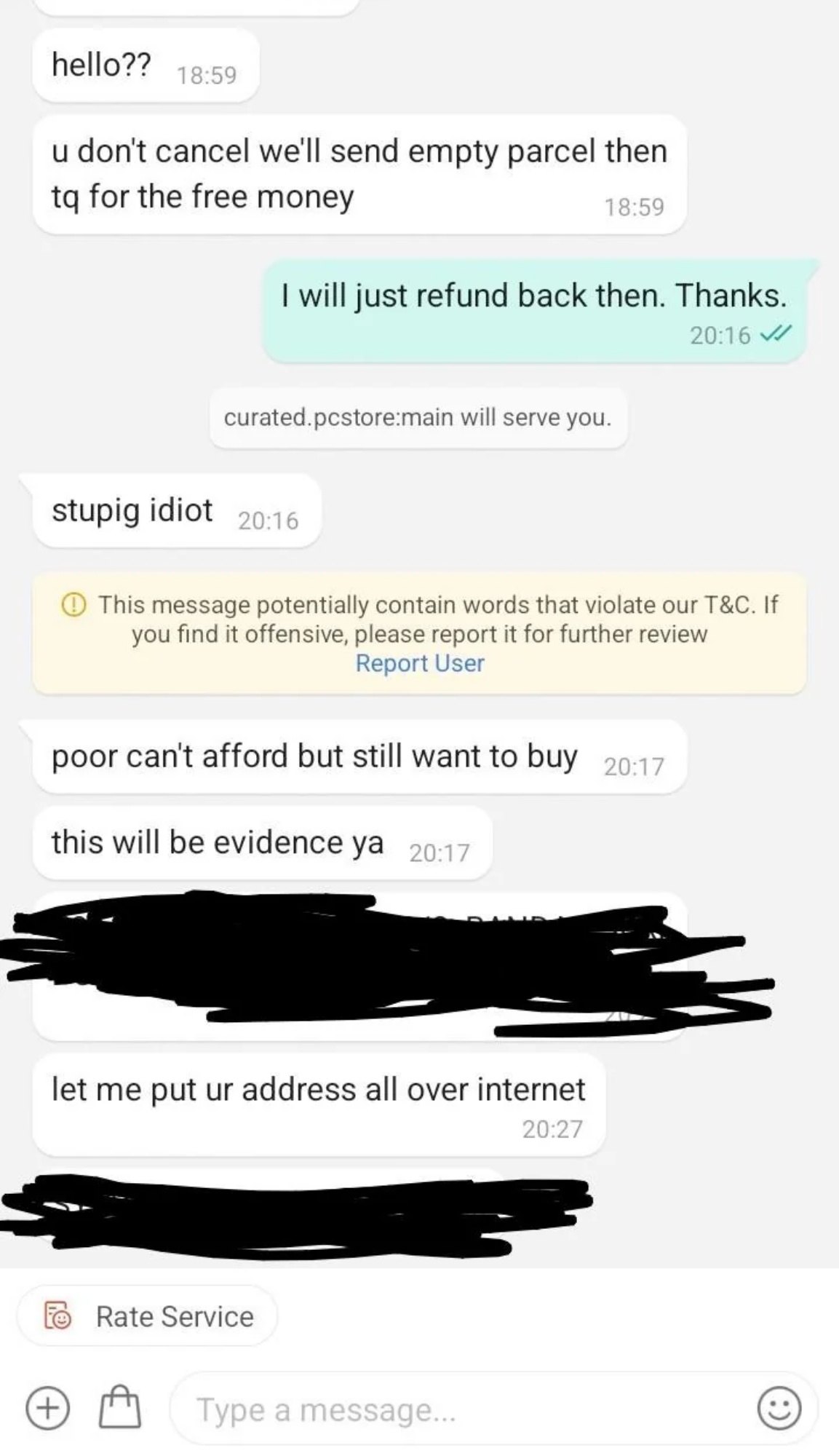 Screenshots shared online show the seller threatening to send an empty parcel instead of the actual product, alongside a sarcastic message thanking the buyer for “free money.” The seller’s messages then became increasingly hostile, insulting the buyer with derogatory remarks and threatening to expose the buyer’s home address online, effectively doxxing them.